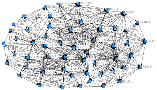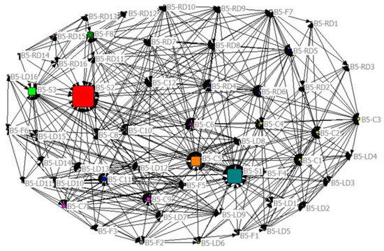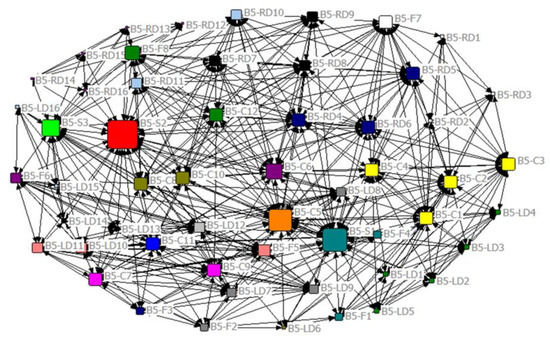 The complex networks of each layer were constructed based on the identified passenger aggregation nodes and passenger flow features. The complex network of B5 layer is shown in Figure 4.