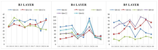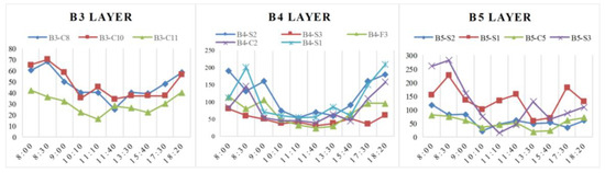 The line charts clearly show the passenger volumes of the different identified key nodes in various time points. In the line chart, the higher the point, the larger passenger volume the point represents. On the B3 floor, the passenger volumes of the nodes B3–C8 and B3–C10 were obviously higher than the node B3–C11. Besides, the degree centrality and the betweenness centrality of the two nodes ranked in the top two among the nodes in the B3 floor network. Thus, the nodes B3–C8 and B3–C10 were determined as high-risk nodes on the B3 floor in rail transit weekday operation. On the B4 floor, the nodes B4–S2, B4–C2, B4–S1 showed higher passenger volumes. Also, these three nodes were identified key nodes which rank in top five among the nodes in B4 floor network. The nodes B4–S2, B4–C2, and B4–S1 were determined as high-risk nodes in B4 floor in rail transit weekday operation. Besides, although the node B4–F3 presented relatively lower passenger volumes, the degree centrality and the betweenness centrality of the node ranked third among the nodes in the B4 floor network. B4–F3 was also determined as the high-risk node on the B4 floor, based on synthetic consideration. On the B5 floor, the nodes B5–S1 and B5–S3 showed obviously higher passenger volumes. The two nodes also ranked in top five among the nodes on the B5 floor network in the evaluation of centrality. Therefore, the nodes B5–S1 and B5–S3 were determined as the high-risk nodes in B5 floor in the rail transit weekday operation.