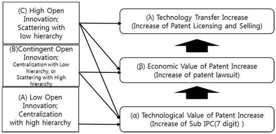 We can use patents to create systematic measures of the intangibles that drive economic growth [16]. Patents that are publicly owned and frequently referenced are normally more valuable than others in an auction environment [17]. A firm’s litigiousness—in other words, its high reputation for toughness on patent enforcement—significantly reduces spillovers by inventor mobility [18]. In the firm’s formalized internal intellectual property value chain with a timing sequence of knowledge generation and loss, if firms in a high open innovation industry increase collaboration, such as engaging in outsourcing, litigation also increases due to the growth of the economic value of patents [19]. However, such open innovation strategies, like strategic alliances, form patent pools, and substantially and significantly decrease both the quantity and quality of patents subsequently generated by licensors and licensees that exist in the linkages between market conditions for technology and economic outcomes [20,21].