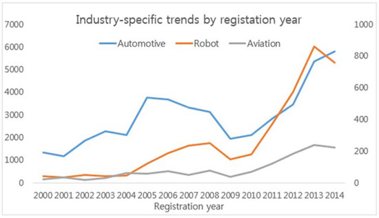 As shown in Table 1, the Korean automobile industry has much larger numbers of patent applications and registrations than the Korean robotics or aerospace industry have, much like the size of the industry itself. However, even though the size of the Korean aerospace industry is not much smaller than the robotics industry, the number of patent applicants and registrations by the robotics industry of Korea is more than double that of the aerospace industry.