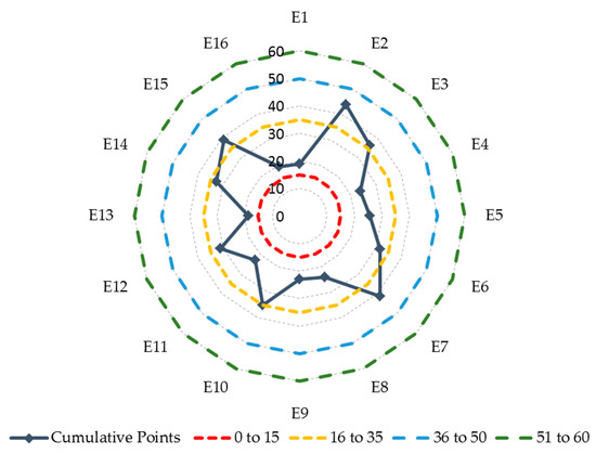 Figure 1 shows the individual results of each company. Based on this, it is possible to notice that the size of the company (at the invoicing level) has a significant effect on the performance of small and medium-sized manufacturing enterprises; the age of the company has no relation with the practices of sustainability. The companies with the best performance were E2, E7, E15, and E3, respectively. All four companies, in addition to obtaining the best scores, also have the highest annual revenues, which can reinforce the idea of having greater power for investments in sustainable practices. It is worth mentioning that company E15, with its short time of existence (only seven years), already stands out in the sustainability aspect. It also reinforces the finding in the study of [22], describing that in Spain, the newer companies showed greater willingness to go beyond environmental legislation.