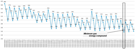 On the other hand, the gas energy-saving effect was the highest in the case of A2, B2, C2, D0, and E2, which refer to high insulation-level roof, external wall insulation, triple insulation glass, the absence of shade installation, and a shade area ratio of 15%, respectively with an energy-saving ratio of 38.9%. The use of glass with a high insulation performance and the installation of shades with a low window area ratio have contributed to an increase in heating-related energy consumption. Usually, the latter increases as well in winter if the indoor influx of sunlight is excessively blocked due to multiple factors. Therefore, the energy simulation results adhering to current legal standards A1, B1, C1, D0, and E0 demonstrate a reduction of 15.2% in annual gas energy.