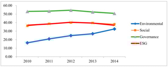 This section examines the pattern and financial characteristics of CRS disclosure scores, such as ESG, environmental, social, and governance disclosure scores. Figure 1 shows the pattern of CSR disclosure scores by year. Environmental disclosure scores (Environmental) increased gradually from 2010 to 2014. More specifically, environmental disclosure scores dramatically increased in 2013. In recent years, there has been considerable attention paid to the importance of environmental CSR by academics and practitioners [5]. This recent development of environmental CSR is highlighted by a survey of 766 CEOs conducted by Accenture and the United Nations Global Compact (UNGC). In the survey, about 93% of the CEOs rated sustainability as a critical factor for their future business success, and 91% responded that their company will adopt new technologies to tackle issues associated with sustainability [61]. In particular, the environmental responsibility (e.g., the reduction in CO2 emissions) in Korea is an important component in implementing CSR activities. Likewise, governance disclosure scores (Governance) are highest among other CSR disclosure scores; they increased by 2012 and then decreased gradually. As such, social disclosure scores (Social) increase gradually, and they have decreased since 2012. Taken together, ESG disclosure scores gradually increased between 2010 and 2012, and then declined.