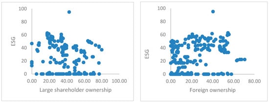 Figure 2 shows the scatter plot between large shareholder ownership and ESG, and between foreign ownership and ESG. The left-hand figure presents the negative correlation between large shareholder ownership and ESG. In contrast, the right-hand figure illustrates the positive correlation between foreign ownership and ESG.