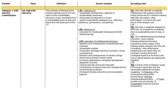 We formulated strict content-analytical rules for the scanning process of ESD relevance, measured by defined categories. Figure 1 shows a translated extract of the coding agenda. Only the highest value of Category 1 is displayed. (original accessible under Supplementary Materials, Document S2).