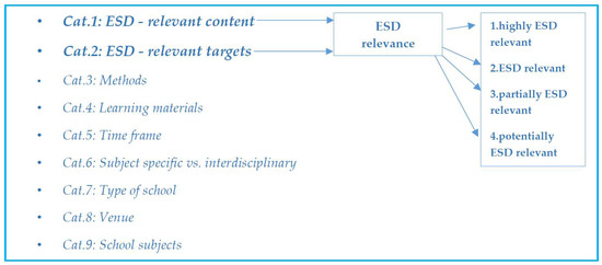 The coding agenda with nine categories (see Figure 2) was validated and tested by four external ESD experts. It contained the name of the variable, their values (on an ordinal grading scale), the definition, anchor samples, and the coding rules.