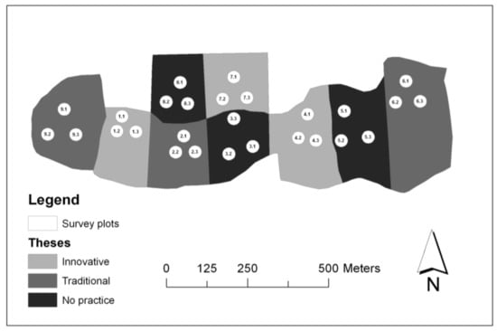 A wide area (30 hectares), divided into 9 compartments, was used as the operational scale at each site. The experimental design allowed a comparative analysis of 3 silvicultural treatments (customary, innovative, and control) randomly assigned to each of the 9 compartments partitioning each site, with 3 replicates per treatment (Figure 1). In accordance with earlier studies [49,54], a cluster of 3 circular sampling plots (radius = 20 m) was established within each compartment to survey the measurement variables and a set of stand structure indicators before and immediately after treatment was calculated accordingly (Table 2). The contagion index and diameter differentiation index were calculated according to the 4 and 3 nearest neighbors to the reference tree, respectively. Indexes were computed for all trees in the plot and then values were averaged. Customary silviculture involved thinning from below throughout the full standing crop. Practices consisted of (1) crown thinning at the older sites, Cansiglio and Vallombrosa; (2) selective thinning releasing a pre-fixed number of trees (40 or 80 per hectare at Chiarano, 0 to 45 at Marchesale), and removal of direct crown competitors. ‘Control’ indicates no intervention/practice and represents a possible management choice in a scenario without management, foreseeable on many Alpine and Apennine beech stands [40,55,56].