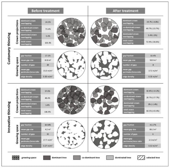 Crown and gap area distribution at one sample plot, before and after each thinning type at Cansiglio (following Fabbio et al. [22], supplemented with figures).