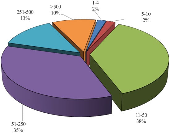 A great deal of respondent organizations operates in the Business to Business market (82%), followed by Business to Consumer (B2C) with 16%. Consistently with these results, Industry is the main represented activity sector (56%) followed by Services (17%) and Commerce and Construction (both with 6%), with the remaining activity sectors representing the remaining 15%. Concerning the organizations’ size, Small and Medium Enterprises (SMEs) accounted for most of the respondents in accordance with the industrial Portuguese population. The distribution of the organizations (percentage) breakdown by the number of employees is presented in Figure 2.