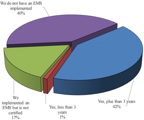 Relating to the implementation and certification of Environmental Management Systems (ISO 14001) 42% of the respondents hold a certified EMS for more than 3 years, 17% hold an implemented EMS without certification but 40% report not holding an implemented EMS, which is an indicator that there is still considerable work to be done in that regard (Figure 3).