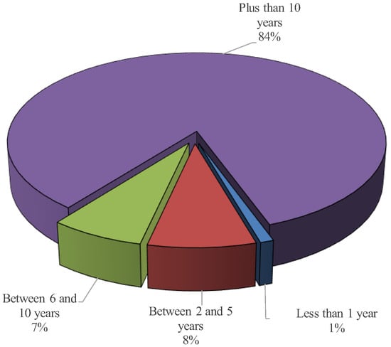 The respondents had considerable experience of the organization, with 84% working there for 10 or more years (Figure 4). Concerning the individual respondents, 23% were Managers/ responsible of the Environment/ Sustainability, followed by 19% CFO (chief financial officer) and 18% CEO/COO (chief executive officer/chief operating officer), which might indicate that the C suite is paying a growing attention to the environment and sustainability (see Figure 5).