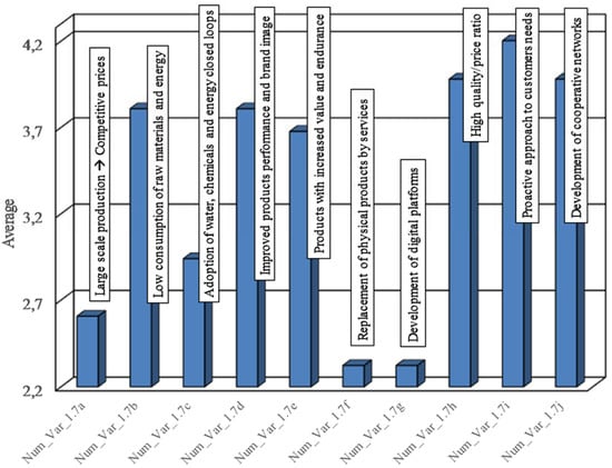 Strategically, the surveyed organizations report to be very customer oriented and to adopt a differentiation or value for money strategy (high quality/price ratio), rather than being low price competitive and volume large-scale producers. This is an option that is consistent with the small size of the organizations and suggests that CE can be aligned with the companies search for innovative and performant processes, products and solutions. The efficient management of energy and the reduction of raw materials consumption is a clear strategic option, as it can output both positive economic (fewer costs) and environmental (lesser impact and pollution) outcomes, which is consistent with the conclusions from previous studies [,,]. However, the adoption of water, chemical products and energy closed loops show medium results (with some variation) and the collection and reuse of products is not very high. The replacement of products by services and the development of digital platforms to sell their products is also low, which might partly explain since most of the organizations are SMEs within the global supply chain and have limited bargaining power and most operate in Business to Business (B2B) market and not in the Business to Consumer (B2C) one. A positive indication is the establishment of collaborative and value-added networks with the organization partners which is a major CE enabler reported in the literature [,,].