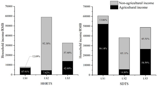 The average income level of households in the HHRTS is slightly lower than in the SDTS. Specifically, the average annual income in the HHRTS is 41,372 yuan. As before, average annual agricultural income is 7491 yuan and annual nonagricultural income is 33,882 yuan. In contrast, the average annual household income in the SDTS is 50,040 yuan. The average annual agricultural income is 29,883 yuan, whereas the average annual nonagricultural income is 20,157 yuan. These findings demonstrate that nonagricultural income is the main income in the HHRTS, while agricultural income contributed the largest proportion of annual household income in the SDTS.