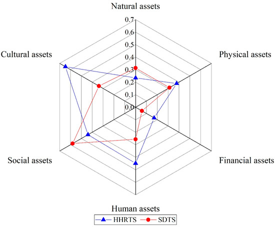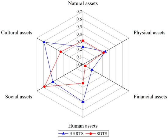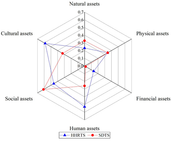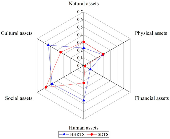 (2) The average livelihood asset value of households in the HHRTS and SDTS is 2.249 and 1.832, respectively. In these two terrace systems, households have similar levels of physical assets, but HHRTS households have advantages in cultural, human, and financial assets. However, SDTS households have advantages in natural and social assets.