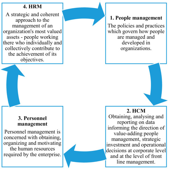 Relationship between the concepts of people management in the enterprise (HCM—human capital management, HRM—human resources management). Source: [20].