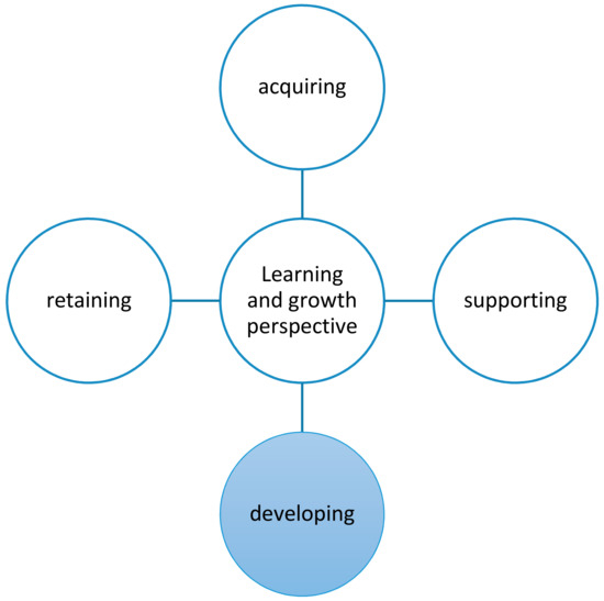 The learning and growth perspective consists of 4 fundamental parts (Figure 6): acquiring, supporting, developing and retaining. All parts are focused on the area of human resources; however, only the “developing” part is focused on the development of HC in enterprises [30]. Authors Chodasová, Tekulová, Hľušková and Jamrichová emphasize that only employees with the increasing value of human capital deliver advantages for the enterprise in the form of higher labour productivity [44]. This, together with new production technology and innovations, leads not only to the growth of efficiency but also of competitiveness of enterprises on the market [45].