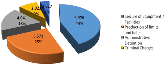 In 2016 alone, there were 22,730 cases in total, reported in the context of these five key measures addressed in the new Environmental Protection Law. Details of these cases, as mentioned in Figure 1, may include: forty-fourpercent of the seizure of equipment or facilities accounted for, twenty-five percent production limits and stoppage, four percent of daily fines, eighteen percent of administrative detentions, and nine percent criminal charges [79].