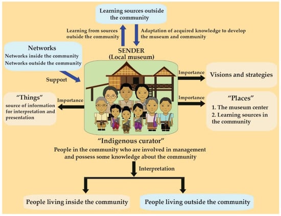 - “Indigenous curator” of the local museum refers to a local person in the community who plays a part in preserving the natural environment and cultural or traditional heritage. They are also responsible for passing on the value of their culture to the next generations to make them aware of the value and to carry on the conservation of their community. According to the experts from the local museum project of the National Museum of Anthropology in Mexico City (as cited in Tojarat Phongsari [12]), a local museum is a museum where people in the community are in charge of sustainability. A local museum is a museum that is established, developed, and managed by the community, for the community. According to Panita Sarawasi, a local museum or folk museum is a museum which local people and organizations created with the objective of developing the local community [13]. Moreover, according to Srisak Wanlipodom’s statement about the indigenous curators of a local museum, “a local museum belongs to the local people; there is no one other than the local people that own it, not any individual, not any government organizations, and not any other outsiders” [14]. The above notions are similar to the three major functions of a local museum proposed by Liu and Lee: community participation, local development, and in-situ preservation. These main functions could promote sustainable development [15]. Additionally, according to Sutter, Sperlish, Worts, Rivard, and Teather, a local museum is the product of the community. Thus, the museum needs to be initiated, crafted, and managed by local residents [16].