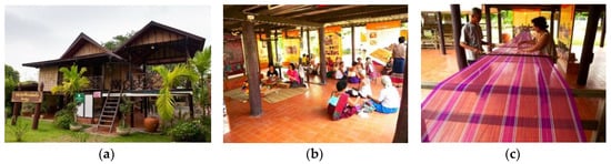 The first floor of the museum building: (a) the Ruen Fha Kho Exhibition; (b) the cultural activities related to Ruen Fha Kho; and (c) local textile weaving (Source: Jirawan Sirivanichkul).