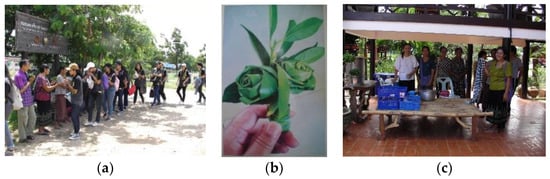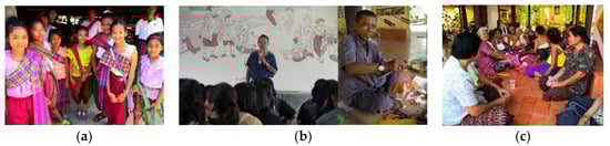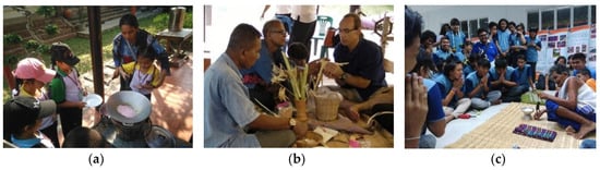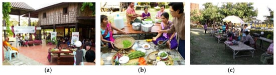 The educational activities: (a) the local dessert cooking activity; (b) the local toy lesson by local intellectuals; and (c) the boon Ta Krai Ritual learning base (Source: Jirawan Sirivanichkul).