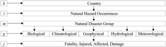 The methodology consists of a set of notations in Figure 1 and a risk assessment model, in which we consider country k as the spatial unit, and hazard occurrences i for the natural disaster group m = 1. This includes sub-groups g, with each resulting in some disaster impacts j, including fatality, injury, affected, and damage. Note that the model collapses all time units (e.g., year) into the 1900–2015 period. Therefore, the model primarily is a spatial one for estimating cumulative expected risks for countries based on multiple impacts. Although disasters happen seemingly randomly, the model does not consider temporal variations, nor spatial variations within country over the period. The model’s main purpose is to estimate country-level expected risks in fatalities, injuries, people affected, and economic damages.