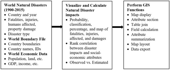 Figure 2 outlines the necessary steps for database processing. The first step is to process tables of human injuries, fatalities, people affected, and damages by country and by year for natural disasters using the EM-DAT database for the period of 1900 to 2015. The second step is to calculate probability weighted risk impacts, their standard deviations, ranks, percentages, and correlations of socio-economic attributes by country. This step also involves validation using the observed natural disaster data and the results for the model using scatter plots and Pearson correlation and Spearman rank order correlation. The third step is to perform GIS functions using “Summarize”, “Join”, and “Field Calculator” on the tables produced in the first and second steps, and the World Boundary GIS layer. This step also produces spatial visualizations of natural disaster risks by country.