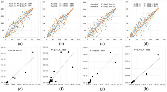 Shown in Figure 3, the Spearman rank correlations for the expected risks and normalized expected risks are very high, ranging from the low 0.904 for fatality (a) RankkF vs. RankkF-PD to the high 0.972 for affected (c) RankkA vs. RankkA-PG. The Pearson correlations are also very high, ranging from the low 0.863 for affected (g) to the high 0.966 for damage (h). It is interesting to note that from Figure 3 (a–d) the lower or higher ranked countries in particular have much higher correlations. This is especially true, due to the small but similar expected and normalized expected risks for countries ranked after 150 for injured (b), and after 175 for damaged (d).