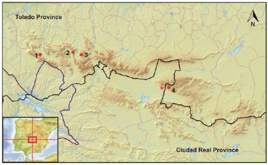 - Martín-Serrano, A.; Molina, E.; Nozal, F.; Carral, M.P. Itinerario A2. Transversal en los Montes de Toledo. In Itinerarios Geomorfológicos por Castilla-La Mancha: Libro de las Excursiones Desarrolladas Durante la VIII Reunión Nacional de Geomorfología, Celebrada en Toledo, 22–25 de Septiembre de 2004; Benito, G., Díez Herrero, A., Eds.; Sociedad Española de Geomorfología-CSIC Centro de Ciencias Medioambientales: Madrid, Spain, 2004; pp. 51–82. ISBN 849219586X. [Google Scholar]