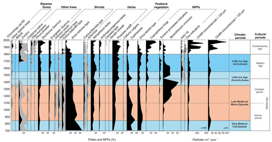 - Pérez-Obiol, R.; Jalut, G.; Julià, R.; Pèlachs, A.; Iriarte, M.J.; Otto, T.; Hernández-Beloqui, B. Mid-Holocene vegetation and climatic history of the Iberian Peninsula. Holocene 2011, 21, 75–93. [Google Scholar] [CrossRef]