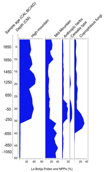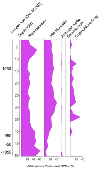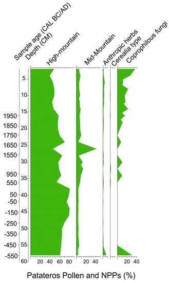 - Cugny, C.; Mazier, F.; Galop, D. Modern and fossil non-pollen palynomorphs from the Basque mountains (western Pyrenees, France): The use of coprophilous fungi to reconstruct pastoral activity. Veg. Hist. Archaeobot. 2010, 19, 391–408. [Google Scholar] [CrossRef]