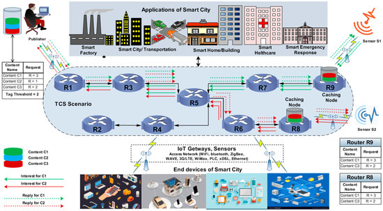 In the tag-based caching strategy (TCS) [30], tag filters (TFs) are used for the proper matching and lookup of the requested contents to disseminate to the appropriate destination. In TCS, all the network nodes are associated with specific tag lists that help to identify highly requested contents to cache the exact location near the preferred users. The tag list is used to generate a TF by using the hash function to improve content dissemination. As the network node receives a request from the user, the corresponding TF decides whether to transmit the content cache to the intermediate location [31]. In this caching strategy, the tags associated with the desired contents are checked by the TF inside the CS, and all the tags are hashed and mapped in a counter to calculate the most requested content. If a tag counter for specific content crosses the threshold, then the content is considered popular. Consequently, all the nodes check the tags to identify the content location and decide whether the content reaches its preferred location to be locally cached. The TCS is demonstrated in Figure 2, in which user-interests are generated from sensors S1 and S2 to retrieve contents C1 and C3 from the publisher. As the predefined tag threshold is 2, the contents are therefore cached near the requested users at routers R8 and R9, because the tags’ values for the requested contents cross the threshold. Thus, contents C1 and C3 will cache at routers R8 and R9 because they received several requests equal to the threshold value, as illustrated in Figure 2.