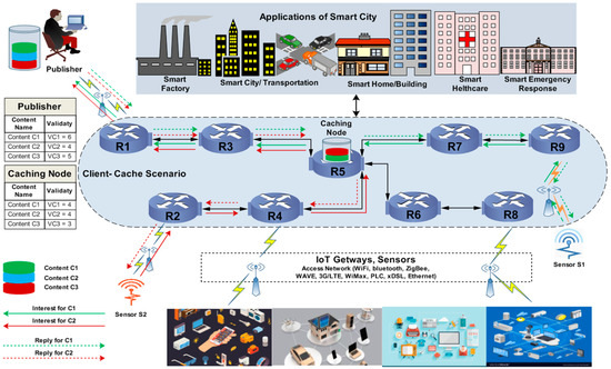 The ICN conception is to decrease the substantial communication overhead caused by the dissemination of analogously accessed contents. Users’ requests are rarely contented by the main publishers. On the other hand, in-networking caching arranges a content replica that is cached at different locations to increase the availability of the desired data. Caching is a crucial component that makes ICN more beneficial than the present Internet architecture. It significantly minimizes the huge volume of data traffic and diminishes the bottleneck caused by publishing data in a unique location. Moreover, caches reduce the distance required for data retrieval. The cache performance totally depends on cache management schemes, which are divided into two mechanisms, namely, content placement strategies and replacement policies. Placement strategies are responsible for tracing the location for disseminated content to be cached according to the placement algorithm, while replacement policies are needed to make room for new incoming contents, once the caches overflow. In fact, subscribers seek data through connecting with different mobile or fixed devices that belong to diverse environments. As a result, caching content within the network will improve the lifetime of the IoT devices’ batteries; for example, an active node may fulfill a request while the information producer remains in sleep mode. Some well-known cache management strategies are Leave Copy Everywhere (LCE) [7], which caches the content at all on-path routers, and Leave Copy Down (LCD) [8], which performs caching at a one level downstream router and edge caching [9] and it copies requested content at only one router according to the stretch. Moreover, ProbCache [10] caches content according to free cache space. The objective of these in-network caching strategies is to improve the overall network performance. Therefore, these strategies focus on crucial issues, such as network bandwidth, power consumption, caching content near consumers, distance between the user and the source, resource (cache and batteries) usability, and content diversity, to increase the availability of the desired information. In such a situation, popularity-based caching strategies achieve a better performance [5,11].