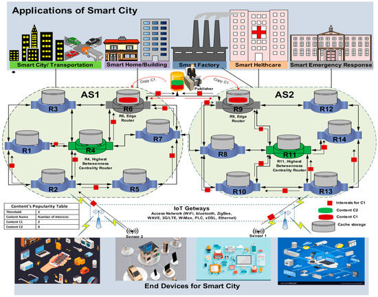 A PCS is proposed to improve the caching performance of an IoT NDN-based caching mechanism. In a PCS, each node is associated with a distinctive statistics table in which interests are calculated to find the most frequently requested content based on content name, frequency count, recently requested time, and threshold. For the particular content name, each node counts the number of incoming interests locally. The threshold is the maximum value managed by the strategy algorithm, which is used to indicate the content most frequently requested. As the interests for specific content reach the threshold, the content is labeled the most frequently requested, and it is recommended for caching at the edge nodes of the autonomous systems (Ass). A PCS is diagrammatically presented in Figure 4. In the given figure, the most frequently requested contents are cached at the edge routers (R6 and R9). As the caches of the routers become full, some contents are evicted from the edge routers, and they follow betweenness centrality in each AS to cache at the routers associated with the highest number of interfaces during content dissemination. In this way, all the incoming interests will be forwarded through the betweenness centrality router. Moreover, if the required contents are found at the betweenness centrality router, the interests are fulfilled here rather than being forwarded to the edge routers or main publishers. For content eviction, a replacement policy named least recently used (LRU) is followed to release the cache of the awaiting content. In this way, the following goals are achieved: first, the cache-to-hit ratio is improved. Because all the interests have traversed through the betweenness central position, most of these interests will be accomplished from the central position. Moreover, the implementation of an AS provides the desired content near the consumers and decreases the path length (stretch) and content retrieval latency. In the case of memory, the heterogeneous contents are cached within an AS, and there is no replication of similar content inside the AS. Therefore, memory is used efficiently, which will reduce the content retrieval delay. In addition, the PCS reduces bandwidth congestion by decreasing homogeneous content replications. The PCS scenario is clarified in Figure 3. Two interests are generated from sensors S1 and S2 to retrieve content C1. According to the threshold, content C1 is recommended as the most frequently requested; therefore, caching at the edge routers of each AS is suggested. Additionally, the PCS presents another considerable benefit related to popular contents. Suppose contents C1 and C2 have their popularities at 700 and 800, respectively, and an incoming content (i.e., content C3) must be cached at the edge router but the cache is full. According to PCS caching, one of the cached contents has to be evicted. However, the evicted content will be cached at the betweenness centrality router; therefore, the content popularity will remain the same, which in turn minimizes bandwidth utilization.
