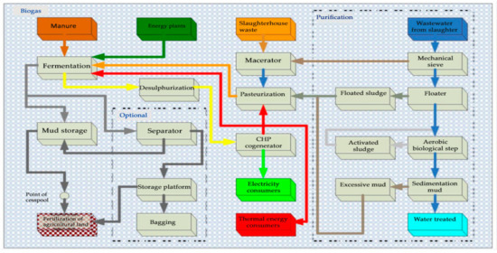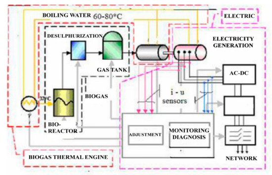 Regarding the investigated system, the main technological flows of the BI are as follows (Figure 1): (i) Fuel circuit involves the reception, preparation and storage of biogas (the total storage capacity of biogas is 111,354 m3, so that it guarantees the operation of the cogeneration plant). (ii) Thermal energy circuit: As a result of the biogas burning process, the resulting heat energy is used for the needs of the slaughterhouse (water is used in the slaughterhouse to produce the heat and processed water needed for the technological flow). (iii) Electrical energy circuit: The electric power is produced by the electric generator; part of the energy is consumed internally to provide electricity for the consumers, while part is exported to the National Power System (NPS), after increasing the voltage level in the lift transformer.