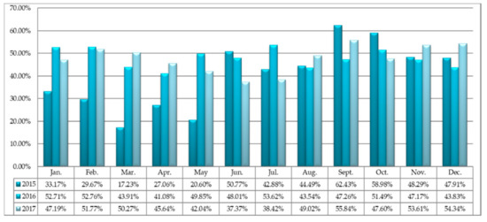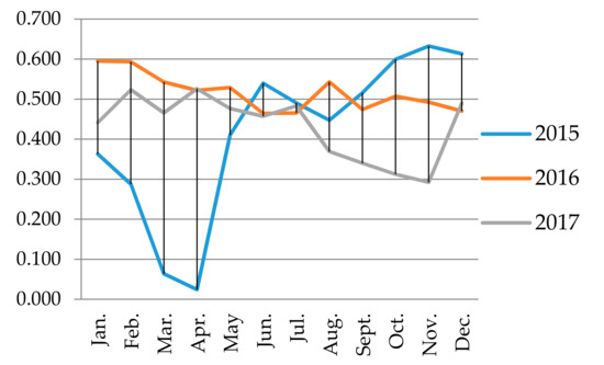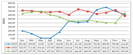 Monthly variation of amount of electricity obtained (MWh) in 2015–2017.