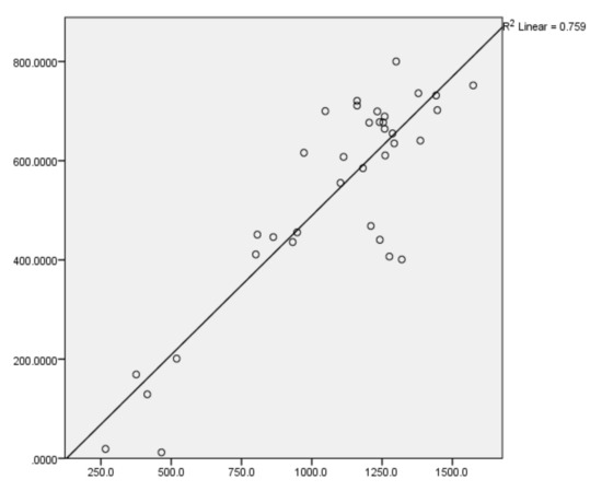 The analysis in SPSS of the link between the amount of waste processed and the amount of electricity obtained reveals the information presented in Figure 6 and Table 4 and Table 5.