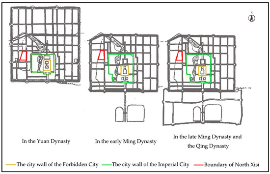 During the Yuan dynasty, the Eight Lanes in North Xisi were located in the southwest part of the city. Influenced by the urban road pattern, the area comprised eight parallel lanes. In the first half of the Ming Dynasty, the north wall and the south wall of Beijing City moved to the south, and the zone was located in the northwest part of the city. After the second half of the Ming Dynasty, a new outer city was built in Beijing that was based on the inner city, and the Eight Lanes in North Xisi were located in the north part of the city. At present, the protected area is located in northwest Beijing in the Xicheng District and is under the jurisdiction of the Xinjiekou Subdistrict Office. The relative location of the Eight Lanes in North Xisi in the old city of Beijing is shown in Figure 1.