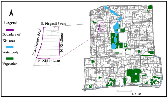 At present, there are 576 door numbers in the area, including a total of 3870 registered households and more than 1000 registered floating population households, with 9942 permanent residents [18]. Its northern boundary is along E. Pinganli Street, the southern boundary is N. Xisi 1st Lane, the western boundary is Zhao Dengyu Road, and the eastern boundary is N. Xisi Street. From south to north, these lanes are respectively N. Xisi 1st Lane, N. Xisi 2nd Lane, N. Xisi 3rd Lane, and so on to N. Xisi 8th lane (Figure 2).