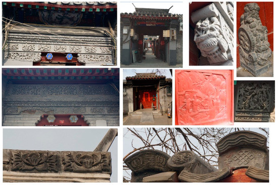 As a traditional residential area with more than 700 years of history, the Eight Lanes in North Xisi area has a rich traditional culture. This traditional culture is represented in three spatial details: the layout and size, the architectural form, and the decoration of the courtyards. First, the courtyards in the area have different layouts and sizes corresponding to the different ranks of officials in the Ming and Qing dynasties. For example, in the 26th year of Hongwu (1393), officials of the first and second ranks had a five-room, nine-frame hall; officials of the third, fourth, and fifth ranks had a five-room, seven-frame hall. Commoners’ dwellings could not exceed a three-room, five-frame hall [19]. Second, there are structures in different locations and with different forms in a single courtyard, including the principal rooms, wing rooms, side rooms, and reverse-facing rooms, and the statuses of those who lived in these structures were different: elders usually lived in the principal room, and the servants usually lived in the reverse-facing rooms. This distinction reflects traditional Chinese culture in its emphasis on priority by rank and respect for seniority [20,21]. Third, in the Ming and Qing dynasties, the decorations and locations of the houses differed according to the hierarchical status of the residents. For example, in the Guangxu period (1871–1908), for officials above the second rank, Watch Animals could be placed on the ridges of the roof. For officials of the third rank, the doorposts were decorated with black chalk. For officials below the fourth rank, the doorposts were painted with flowers [22]. The form of the gate and style of the quadrangle courtyards also reflected the status of the residents. For example, in the 8th year of the reign of Emperor Shunzhi (1651), the door steps were two chi high (“chi” is an ancient unit of measure in China; one chi is approximately 31 centimeters) for officials of the first through third ranks and one chi high for officials below the fourth rank and commoners, and the door was decorated with black [22]. In addition, the building decoration in the courtyards primarily depicts plants, animals, ancient artefacts, and combinations of patterns; the representational culture is depicted using traditional symbols of good fortune, with the inspirational culture and ethical culture expressed through homophonic, consonant, and hieroglyphic methods (Figure 3) [19,23].