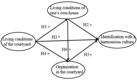 Based on the existing research results and combined with the actual situation in this case, SEM is performed in this paper with four latent variables: living conditions of the courtyard, living conditions of one’s own house, organization in the courtyard, and identification with a harmonious culture. The latent variables and observable variables of this model are shown in Figure 6 and Table 1. The variables and paths are designed based on the following: (1) According to Pettigrew, the nature and size of neighborhoods influence the link and contact between them, which in turn influence cultural identity [33]. Allport noted that neighborhoods are an important venue for intergroup contact [34]. Zhou Shangyi found that the proportion of out-of-towners living in a courtyard influenced residents’ identification with the residential culture [24]. Xue Rui observed that the residential conditions of courtyards in the Xisi district were closely related to the number of households, the number of people, and the per capita area [35]. Michelson found that an excellent physical environment was more conducive to promoting neighbors’ culturally required behavior [36]. Based on these findings, the four observable variables labelled C1–C4 were used in this paper to evaluate the latent variable of “living conditions of the courtyard”, and a path of positive influence (H3) from “living conditions of the courtyard” to “identification with a harmonious culture” was assumed. (2) According to research by Hanif, Hashemnejad, and Ghafourian, physical comfort depends on proper living conditions, and physical discomfort can lead to psychological discomposure [37]. Muller proposed that some behavioral norms are the result of cultural traditions and clearly have spatial implications. Thus, limitations to space should be adjusted by, for example, manipulating perceived distance [38]. Through investigation of the courtyards in the Xisi district, Li Yingbo et al. found that most residents believed it was necessary to increase the size and number of houses, as their living conditions limited their identification with courtyard culture and residents would be more harmonious if their living conditions improved [39]. According to these findings, the latent variable of “living conditions of one’s own house” was determined in this paper by four observation variables labelled S1–S4, and a path of positive influence (H2) from “living conditions of one’s own house” to “identification with a harmonious culture” was assumed. (3) Plummer argued that non-governmental civil society could play a positive role in mediating conflicts and resolving disputes and could strengthen the cultural identity of residents [40]. Zhou Shangyi and others have found that residents of courtyards in the Xisi area that have authority figures are more harmonious [24]. According to Carmona, De Magalhaes and Hammond, space organizers set rules, maintain facilities, and clean up garbage for all space users [41]. Jiao Yixue also asserted that when the central figure of the courtyard participates and acts as a moderator in the courts, the needs and desires of the residents are valued and respected, and the residents’ identification with a harmonious culture can be strengthened [42]. Wang Liang suggested that residents can strengthen their sense of belonging and identity if they are organized to cope with unexpected events [43]. Based on these studies, “organization in the courtyard” is assigned three observable variables, O1–O3, and a path of positive influence (H5) from “organization in the courtyard” to “identification with a harmonious culture” was hypothesized. (4) According to Hanif, Hashemnejad, and Ghafourian, spatial organization can be studied as a method of expressing certain sets of cultural norms [37]. This paper thus assumes a path of positive impact (H4) from “living conditions of the courtyard” to “organization in the courtyard”. (5) Smith asserted that houses that fail to take adequate account of the structure and needs of residents do not consider the unique identity of local cultural tradition [44]. Cui Hui and others noted that historically, the public space of quadrangle courtyards was a place for residents to communicate with each other, and residents formed harmonious neighborhood feelings in such spaces [45]. Some scholars have suggested that sustainable dwellings require large open spaces [37]. Moreover, according to Wang Zhenzhen, the traditional public space of the historical district contributed to a harmonious neighborhood life [46]. Upon investigation, Liu Yuanxin found that in Beijing quadrangle courtyards, many households currently forcibly occupy the public space (by building additions to houses, storing clutter, etc.), and it is not uncommon for residents to expect each other to mind their own business, which results in poor public health conditions and frequent conflicts among residents [47]. Zhou Kejing and others argued that the small, crowded public space of Beijing quadrangle courtyards has negative effects on residents, severely affecting their mood and identification with the residential culture [48]. Accordingly, four observable variables, M1–M4, are assigned to the latent variable “identification with a harmonious culture”. (6) Yuan Xi found that in modern quadrangle courtyards, the size and number of rooms in a house are directly proportional to the income of the family, which is also directly proportional to the number of households and the number of residents in the courtyard [49]. Thus, this paper assumes a path of positive impact (H1) from “living conditions of the courtyard” to “living conditions of one’s own house”. (7) Zhou Shangyi reported that in many of the courtyards in the Xisi district, there are key individuals in the courtyard who have more control over the spatial discourse and more resources and shoulder more responsibilitie