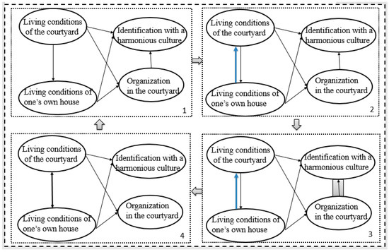 (1) “Identification with a harmonious culture” is positively affected by “the proportion of public space”, “forms of mutual assistance”, and “use pattern of public spaces”, but according to the factor loading, the size of the impact differs. “Identification with a harmonious culture” is more positively affected by the first two observable variables than the third one, and it is more positively affected by the first one than the second one. In other words, the smaller the proportion of public space, the less mutual assistance and the less identification the residents have with the harmonious culture of courtyards in the Xisi area of Beijing. The forms of mutual assistance in the neighborhood are sharing food, helping care for the elderly and children, helping to look after the poor, and borrowing things from each other, etc. The public spaces have many uses, and residents can be found drinking tea and chatting, playing chess, airing out clothing, storing bikes, and stacking sundry items there, as well as using the space as a corridor.