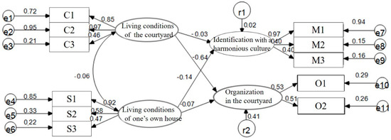 The refined model was examined, and some indicators did not meet the test criteria. Thus, the model needed to be corrected. First, the theoretical significance of the model must be considered during correction. Second, it is necessary to add or delete paths according to the modification index (MI) and the t value (critical ratio) to improve the model fit and make the model more parsimonious. Paths are added when the preferred MI value is at maximum; paths are deleted when the preferred t value is at minimum. According to these principles, the path from “living conditions of one’s own house” to “living conditions of the courtyard” was added and tested according to the MI value. This change resulted in one pair of variables becoming connected, causing other MI values to change. After the test, the chi-square value was reduced (chi-square = 48), so the correction was meaningful. However, some indicators still did not meet the criteria and needed to be corrected, as indicated by the minimum value of t. Thus, the path from “organization in the courtyard” to “identification with a harmonious culture” was deleted. The process of path modification and model correction is shown in Figure 7. The second modified model was analyzed and tested using the maximum likelihood method. According to the results, the model is convergent and identifiable. The chi-square value = 48.973, indicating no significant increase and that path deletion is feasible. The Df and p values met the criteria. The error values of the potential and observable variables of the model were both positive and reached 0.05, and the standard deviation of the variance was relatively small, indicating no model definition error and no model violation of the recognition rules. The corrected standardized parameter estimation path model is shown in Figure 8. The other values of the test met the standard (the model adaptation table is shown in Table 6); therefore, the model has good fit and is parsimonious.
