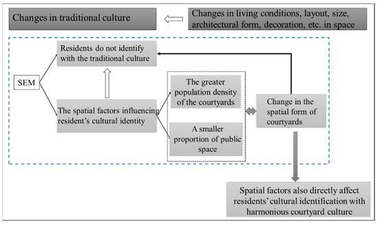 The issue of identity is very complex and determining the factors influencing cultural identity is a key issue. Several scholars have studied the factors influencing cultural identity. However, relatively little attention has been paid to how spatial factors influence cultural identity. This paper takes a historical and cultural conservation block in Beijing, China, as the research area. This area includes eight lanes and is called Eight Lanes in North Xisi. The purpose of this paper is to demonstrate that spatial changes in living conditions, layout, size, architectural form, and decoration, etc. in the courtyards led to changes in the traditional culture of the courtyards, which ceased to reflect the original residential culture, which led to a decline in cultural identity. Spatial factors directly affected the residents’ cultural identification with harmonious courtyard culture. This view adds nuance to debates about cultural identity and the factors that influence it. From the perspective of cultural geography and by using structural equation modelling, we draw two main conclusions. First, the smaller proportion of public space (The term “space” as it is used in this paper is based on the understanding of humanistic geographers and refers to physical space; it does not acquire meaning and cultures.) is one main factor affecting residents’ identification with the harmonious residential culture of the case area. Second, the greater population density of the courtyards is another main factor affecting residents’ identification with the area’s harmonious residential culture.