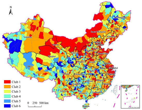 Spatial distribution of county economic growth convergence clubs in China (source: modified by the authors).