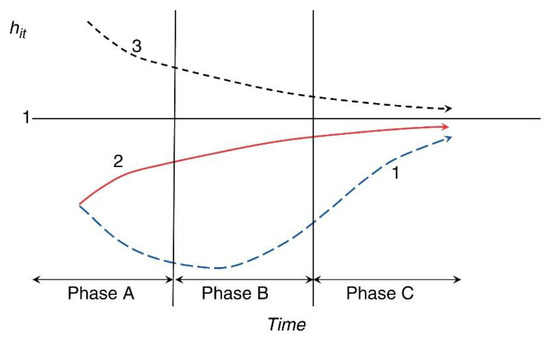 To further examine the transition path of different convergence clubs, the economic growth transition path curve introduced by Phillips et al. [2] was employed. Theoretically, Figure 2 shows relative transition trends for three typical economies. Economies 2 and 3 present differing initial conditions, and the transition paths are quite different. However, relative transition parameters for the two economies converge into the same value. Route 3 involves transition from a high initial level and refers to an average developed industrial economy. Path 2, characterized by a low initial state, reflects the path of a newly industrializing and growing economy. Economies 1 and 2 present the same initial conditions but involve a long-term process of divergence and late catch-up; both eventually tend to achieve convergence. From a transition time period perspective, route 1 is more likely to reflect a typical developing economy, in which initial growth rates (in phase A) are slow, but where economic conditions in phase B begin to change, with the economy growing rapidly and realizing relative convergence in phase C.
