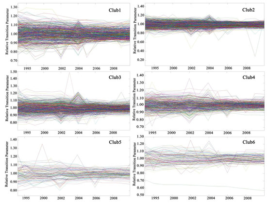 Figure 4 shows the relative transition paths inside the six convergence clubs. All six clubs generally showed convergence behaviors. In terms of the initial conditions and performances found at the end of the period, the six convergence clubs exhibited different internal convergence levels and transition paths. We also found that the initial conditions for counties within the clubs differed significantly, which significantly affects the transition path. However, some counties showed unstable trends, indicating the presence of regional spatial agglomeration, as shown in Figure 1, within clubs or between neighboring counties. Regarding transition time periods, we identified two mutation time periods (2002 and 2006) and found that the transition paths have been converging to a stable state gradually since 2006, reinforcing the previous result.