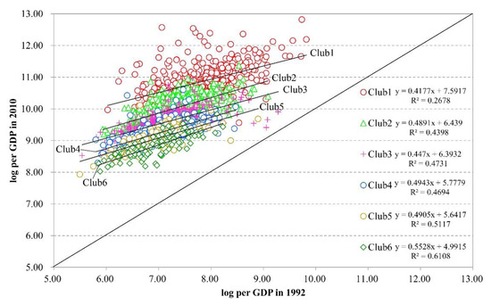 We compared initial stage scatterplots with those for the end of the period to further clarify the implication of the relative transition path method. The black line in the middle of Figure 5 represents the 45° line. The distance between this line and each point denotes the average rate of growth of each point for 1992–2010. Figure 5 shows that all points fall above the 45° line, indicating that all 2286 counties realized GDP per capita growth from 1992 to 2010. However, relative significant differences are also found between the six clubs with respect to the constant values of the trend line, illustrating significant heterogeneity between the clubs. Regarding initial levels, the general trends are as follows: club 1> club 2> club 3> club 4> club 5> club 6. Regarding growth rates, the clubs show similar trends. Rather, high-income clubs show higher growth rates than low-income clubs, particularly for club 1, which includes points that far exceed the 45° line. Therefore, according to the whole trend, classical β convergence behaviors do not show if only initial and final GDP per capita values are observed. It is clearly difficult for lagging counties to catch up with their counterparts, though general convergence trends are found within the clubs. Therefore, studies of convergence clubs in regional economic growth may be more feasible.