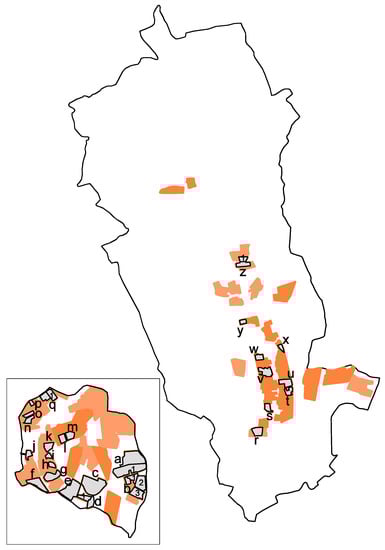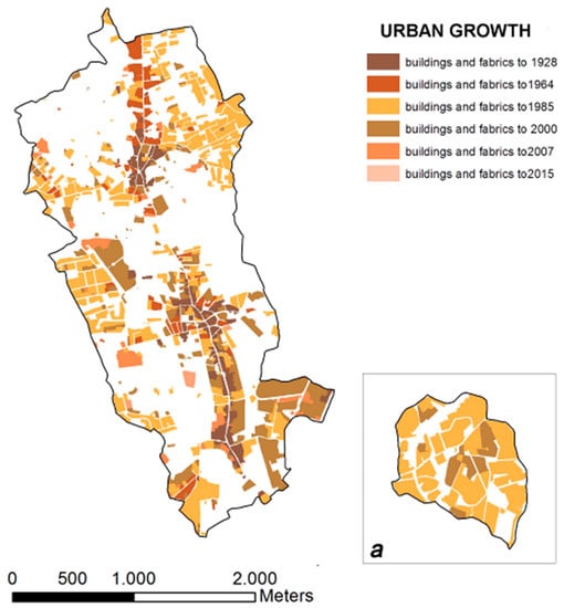 Urban growth analysis showed that in the tested municipality the majority of the urban fabric was developed after 1964 (56% in terms of building area, BA), with a first impressive boost in the period 1964–1985 and a second in the period 1985–2000 [32] (Figure 4, Table 3).