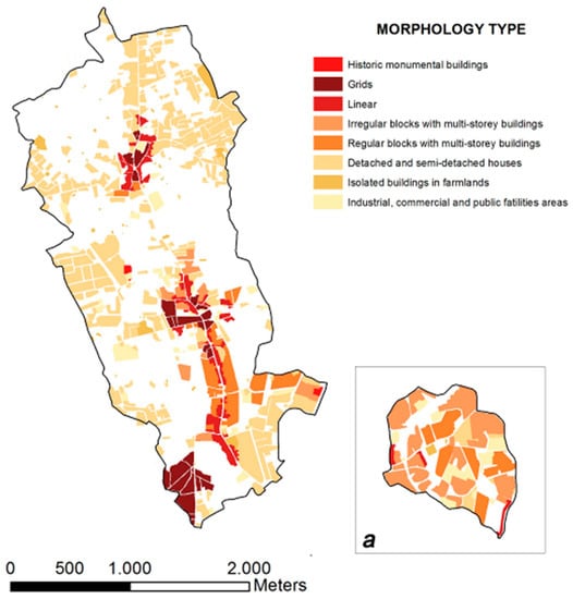 Urban morphology map of the municipality of Tremestieri Etneo, Catania (Italy); (a) enclave of the municipality located at the south-east end of the territory.