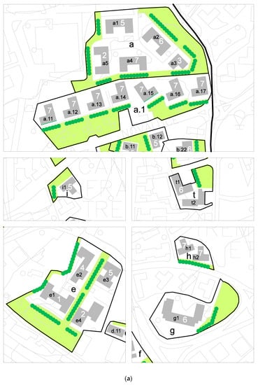 Urban morphology analysis identified those buildings where the green infrastructure strategy could be implemented. This was developed at block and sub-block level taking into account results from the previous urban growth analysis and considered two additional features: type of buildings, such as detached or semi-detached houses, terraced houses, multi-storey apartments, towers; and the relationship among buildings, streets and public and private open spaces, that can be characterized by interior courtyards or front/rear/side setback yards, sidewalks, parking lots, or small urban gardens. Different combinations of these features produced varied morphological layouts and built-up density. Building coverage ratio and percentage of open spaces were measured to identify urban morphology types. The urban morphology analysis was based on a regional topographic map (1:10,000) and a more detailed municipal topographic map (1:2000). Here the green infrastructure strategy was implemented for regular and irregular blocks with multi-storey buildings of reinforced concrete frame structures. Regular and irregular blocks are composed of different compounds, defined as gated residential units of buildings and related open spaces. These compounds are characterized by very large residential population, multiple private properties (apartments, garages), spaces with shared assets such as lobbies, staircases, lifts and adjacent open setback yards (walkways, green spaces, and park plots) (Figure 2).